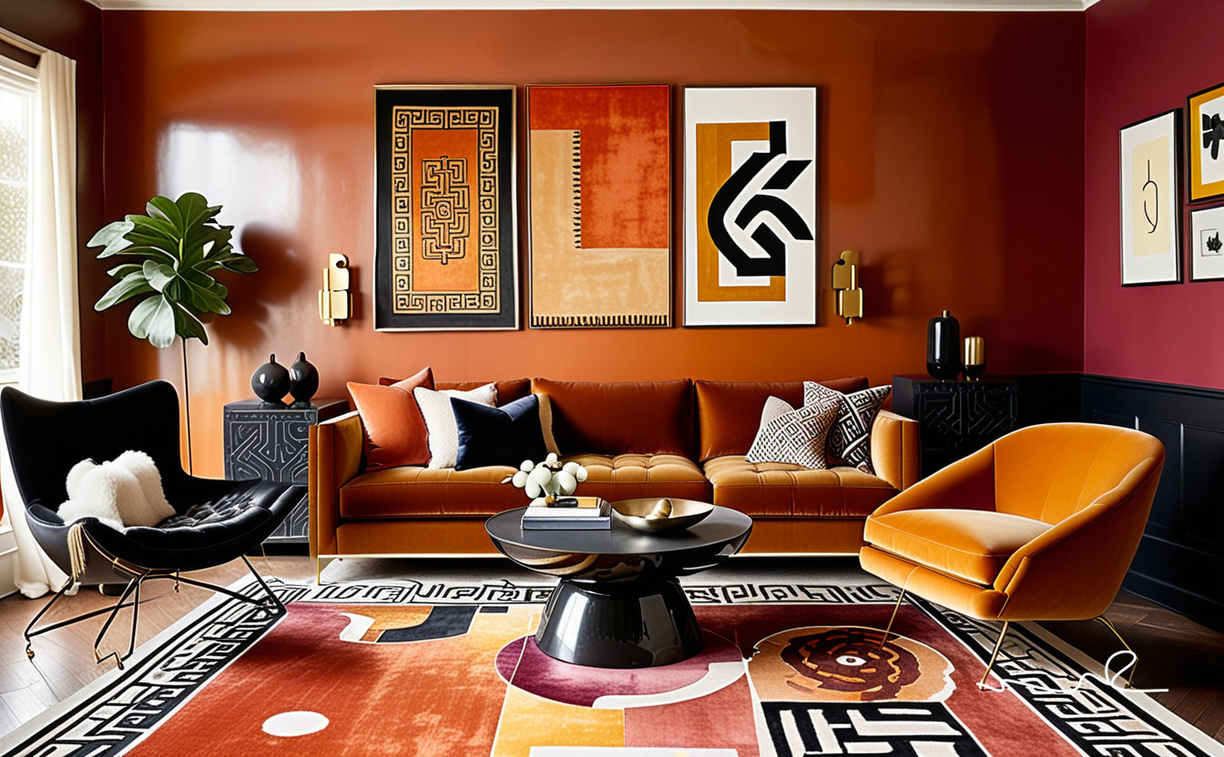 Step into signature living spaces that transcends ordinary design. This bespoke Art Deco-inspired collection weaves together the richness of textured red, white, and black abstract tile patterns on a bold accent wall, adding depth and contour.